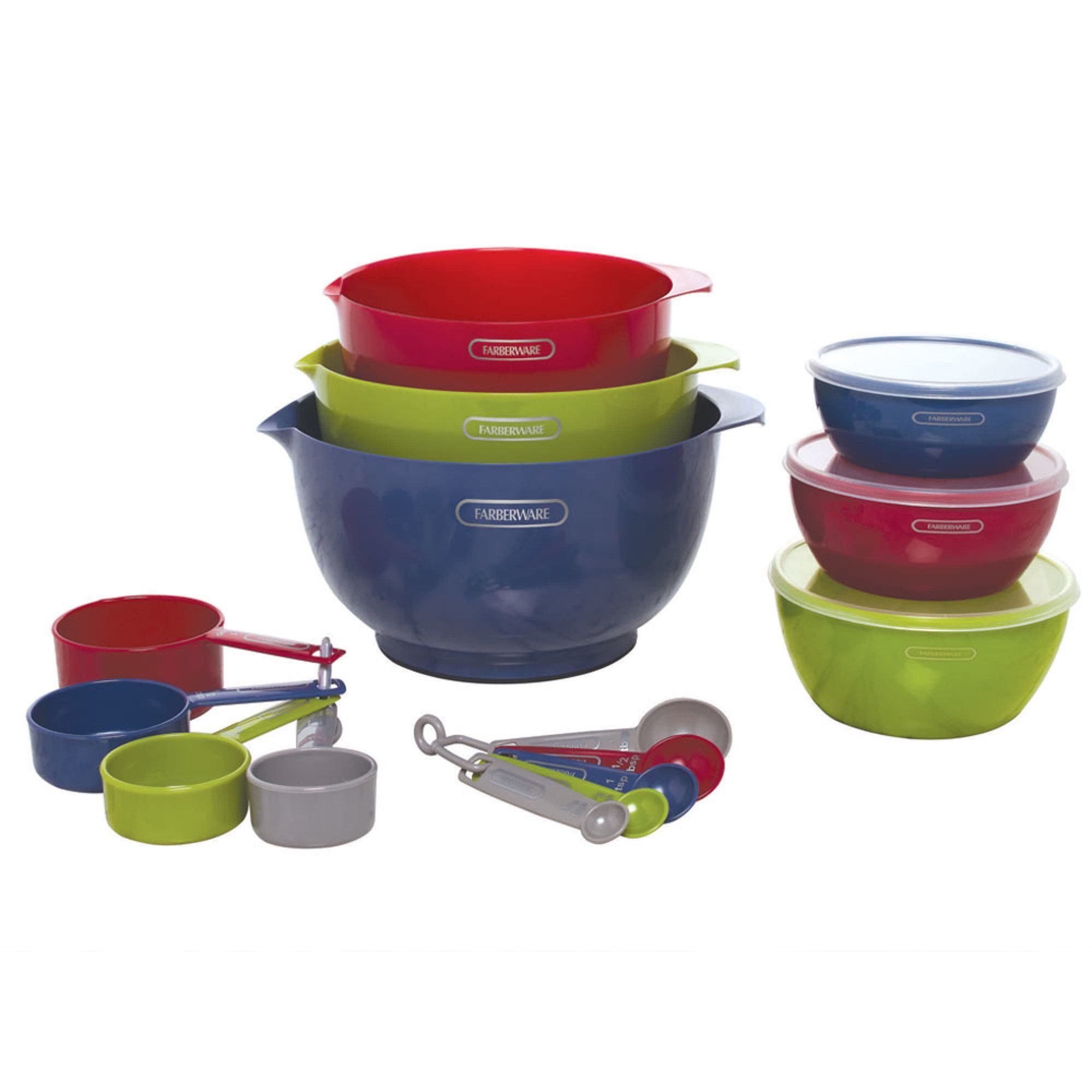 This Farberware Professional 18-piece Mix and Measure Assorted Set includes 3 mixing bowls with lids, 5 measuring spoons, and 4 measuring cups. Measuring cup capacity: 1/4-cup, 1/3-cup, 1/2-cup, and 1-cup. Measuring spoon capacity: 1/4-teaspoon, 1/2-teaspoon, 1-teaspoon, ½-tablespoon, and 1-tablespoon.