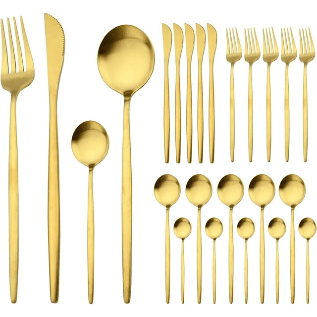24 pcs gold flatware set for 6: derclive gold flatware set includes 6 knives, 6 forks, 6 spoons and 6 dessert spoons. It's a good dining tool for family or restaurant.
