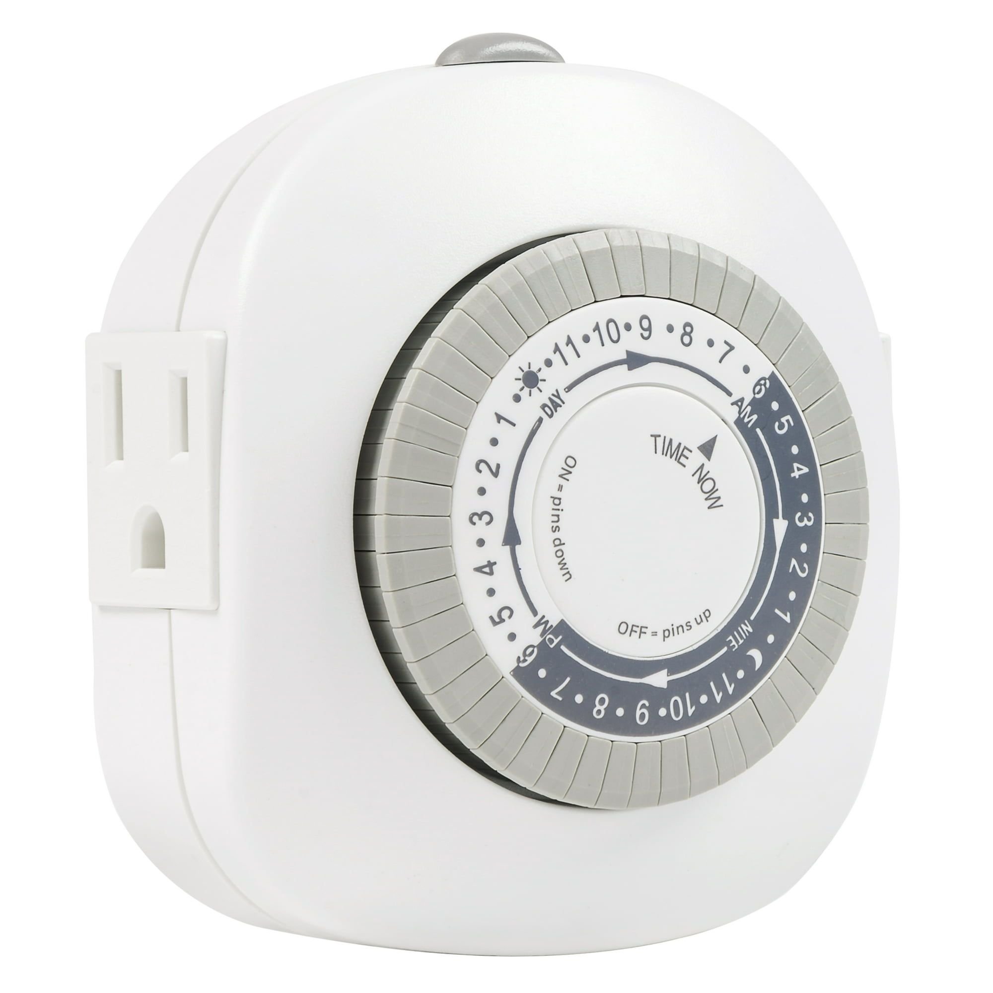 Hyper Tough Indoor Grounded Timer with two, 3- prong outlet will automate your home with on and off set times. Timer is easy to set in 30-minute intervals and provides up to 24 on/off setting per day. Pins are easy-to use and built-in for convenience. Push pins down or pull up to set your on and off time. Features a manual override switch. CFL and LED compatible.