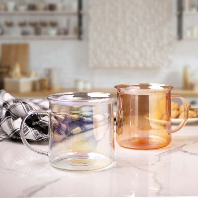 Mainstays glass mug 18 oz Amber Camp Glass mugs are a must have. These modern mugs will maintain the toasty temperature of your favorite beverage. They are made from heat resistant Borosilicate glass which makes them suitable for all beverages hot and cold. These mugs are sturdy they are great for everyday use and gift giving. Hand wash and microwave safe.