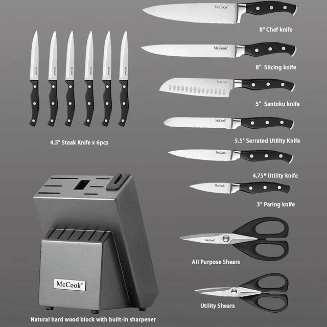 The mccook black knife set features one piece made stainless steel, black handles secured by triple rivets and a graphite knife block with built-in sharpener designed to keep knives at optimum sharpness every time you use them.The built-in sharpener is amazing.