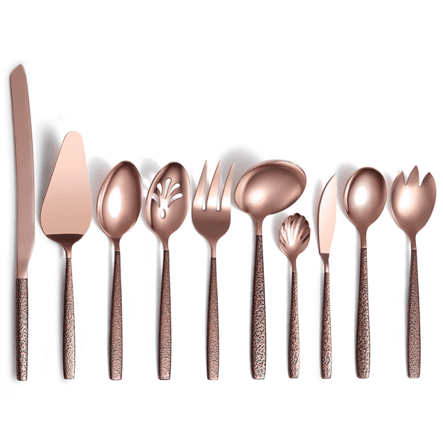 10 piece moon surface handle shiny rose gold head flatware serving set including 1 serving spoon, 1 slotted serving spoon, 1 cold meat fork, 1 sugar spoon, 1 cake server, 1 cake knife, 1 butter knife, 1 gravy ladle, 1 salad spoon, 1 salad fork.