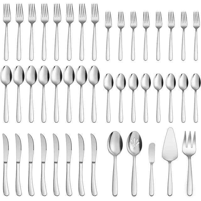 Vesteel 45-piece heavy duty silverware set is made of high-class stainless steel, rust resistant, thick and sturdy structure will last a long lifetime. Heavier weight will provide you great hand feeling. Classy appearance always keep shiny with mirror polished. Concise design without any redundant pattern can match your existing table settings harmoniously. Additional 5 serving utensils, multipurpose use for formal and casual occasions. These eating utensils are really ideal for large family, restaurant, farmhouse, entertaining, wedding, buffet, party, picnic.