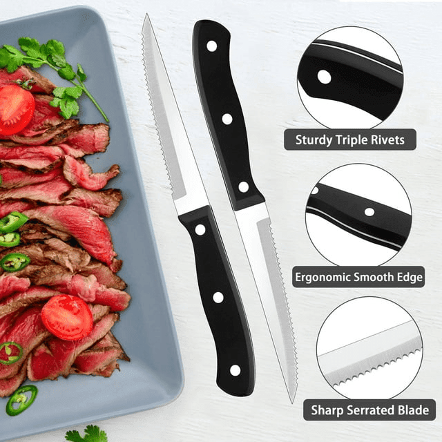 Plus steak knives & serving utensils - steak knives have serrated blade for cutting meat effortlessly, sturdy triple rivets handle is designed according to the feature of grasping hands, perfectly fit your hands, large size serving utensils is convenient for serving soup, straining juice, stirring sauce, preparing mashed potatoes...