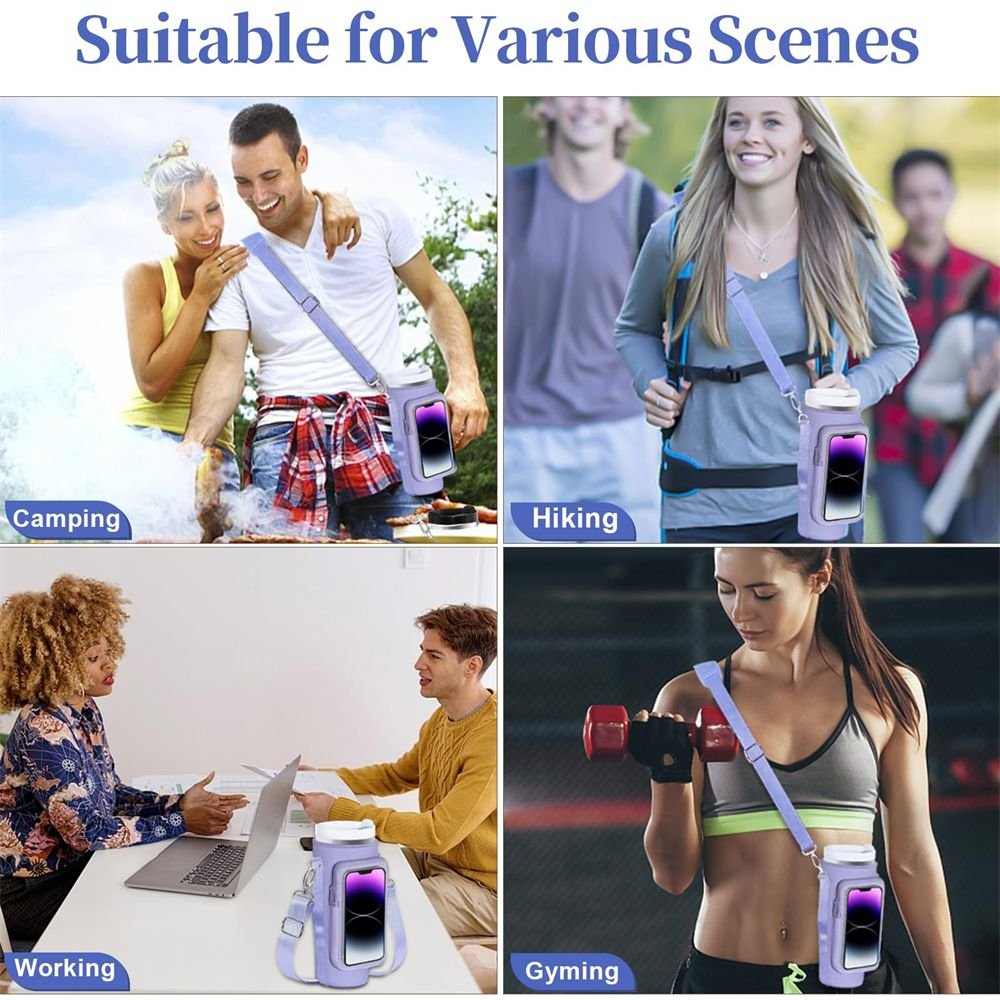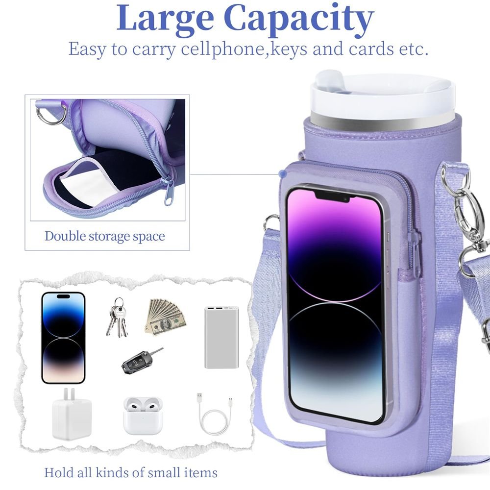 2.Bottle Carrier with Phone Pocket: The Sleeve has two layers of pockets, the front is a touch-sensitive cell phone pocket, so you can easily access your phone on the go, fits up to a 6.7in for iPhone 14 Pro Max. and the back pocket compartment can hold cash, cards, keys, gym cards, and other small items. This Stanley carrier bag is the perfect companion for outdoor activities, travel, and everyday use.