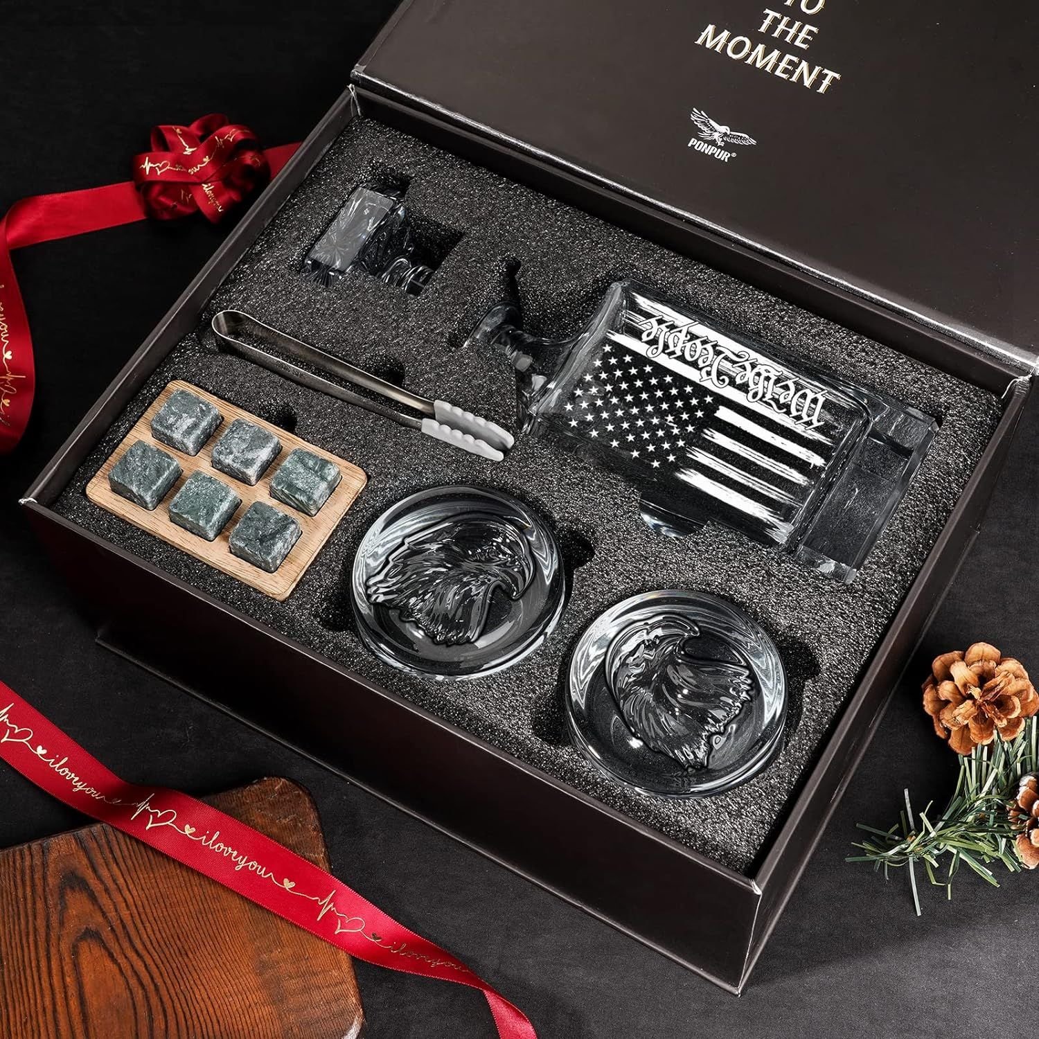 This set includes a decanter, two whiskey glasses, six whiskey stones, a wooden tray, a stones bag, an ice tong, and a whiskey card. Packaged exquisitely and securely, it's designed for men and makes for ideal Christmas gifts, birthday gifts, anniversary gifts, Father's Day gifts, Boss's Day gifts, Independence Day gifts, or Patriot Day commemorations.